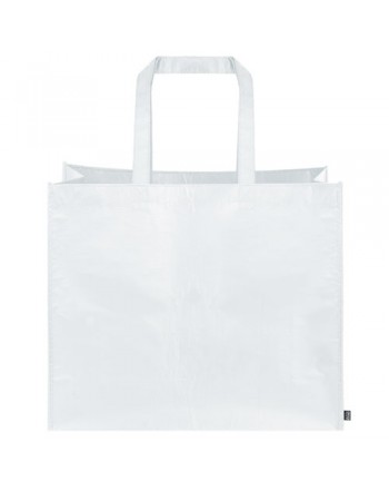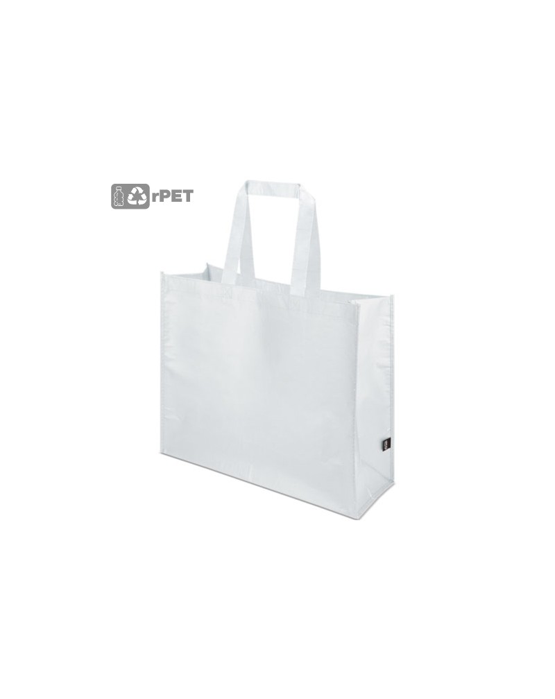 Bolsa realizada en material RPET, disponible en colores azul, blanco, rojo, verde, negro y lila.(Medida asa 52x2,5 cm)