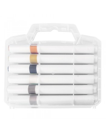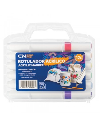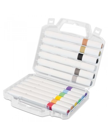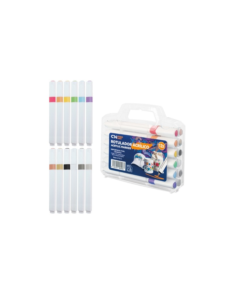 Set de 12 rotuladores acrílicos surtidos de color, presentados en un maletín transparente.