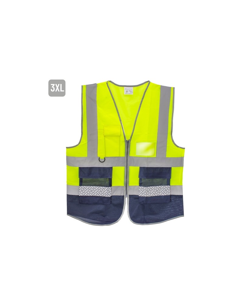 Chaleco alta visibilidad.Incluye dos bolsillos laterales (medida 16x18.5cm), compartimento para acreditación (medida 10.5x7.2 cm) y un bolsillo con cierre de velcro (medida 6.5x15 cm).Cada pieza en bolsa individualGuía de tallasL; 60x70 cm( ancho por largo)3XL; 68x74 cm( ancho por largo)