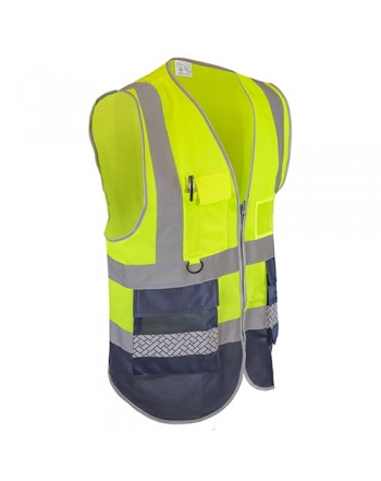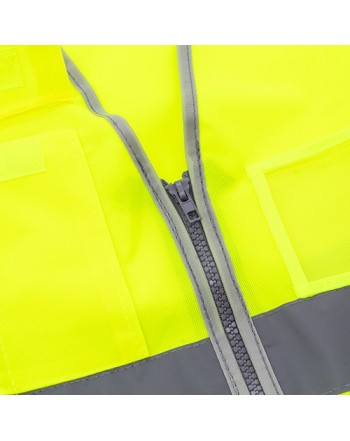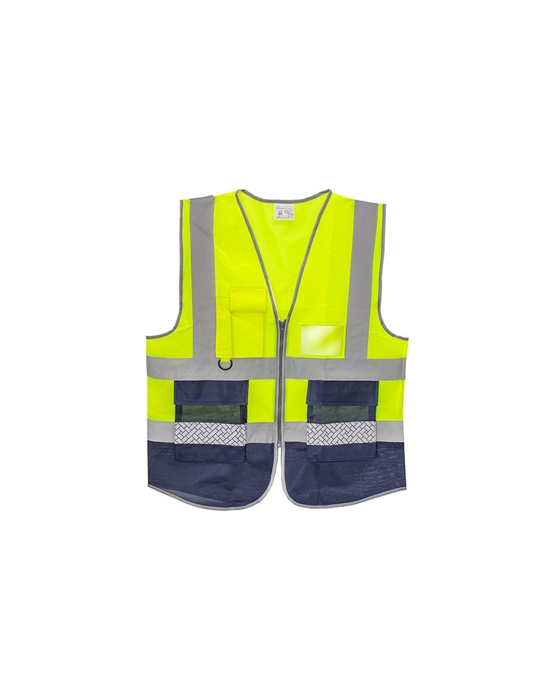 Chaleco alta visibilidad.Incluye dos bolsillos laterales (medida 16x18.5cm), compartimento para acreditación (medida 10.5x7.2 cm) y un bolsillo con cierre de velcro (medida 6.5x15 cm).Cada pieza en bolsa individual, con Guía de tallasL; 60x70 cm( ancho por largo)3XL; 68x74 cm( ancho por largo)