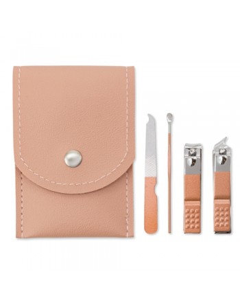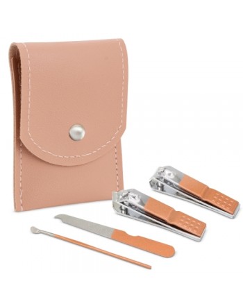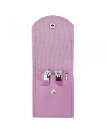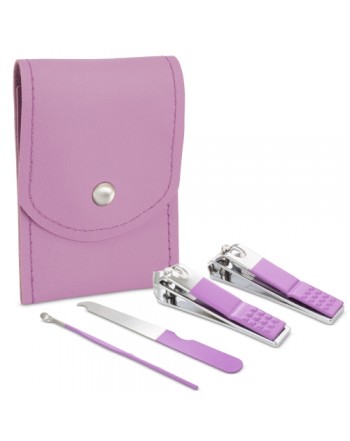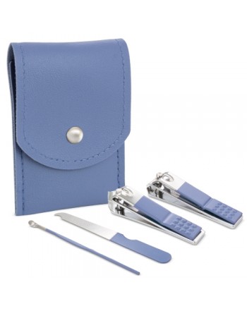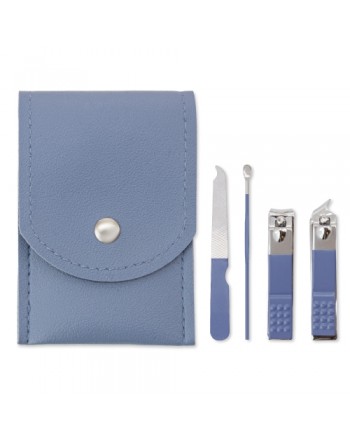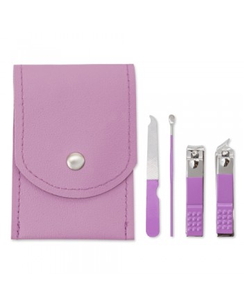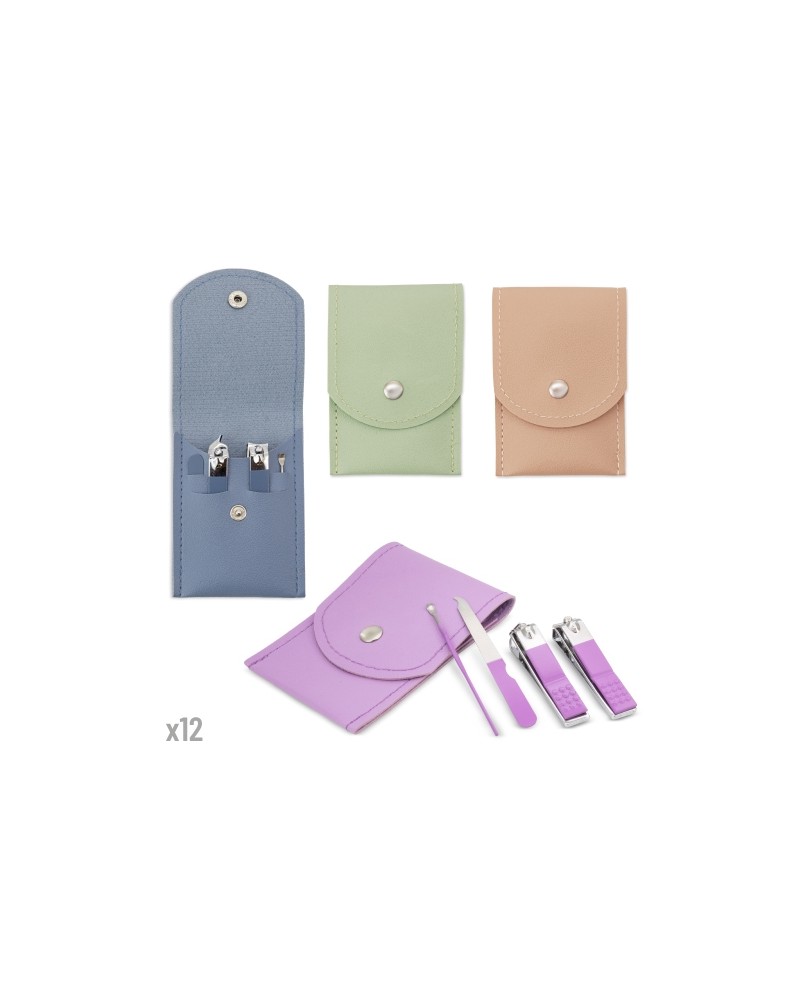 Set de manicura, disponible en cuatro colores, incluye dos cortaúñas, una lima y herramienta para las cutículas.Se sirve en un set de 12 unidades surtidas de color.