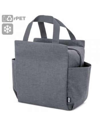 Bolsa nevera de gran capacidad realizada en material RPET, ligera y facil de transportarIncluye un bolsillo exterior, medida 12x11 cmAsas acolchadas y ligerasDisponible en colores negro, royal, burdeos y grisCada pieza presentada en bolsa individual