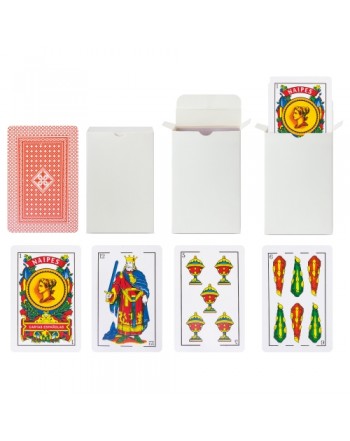 Contiene 50 Cartas, incluidos los comodines. Medida Cartas: 6.2x9.5 cmCada baraja presentada en una cajita blanca retractilada, en el caso de marcar, se sirve sin retractilar.