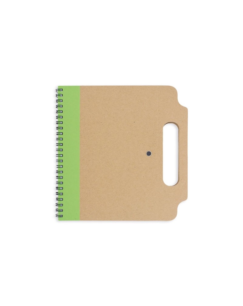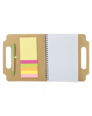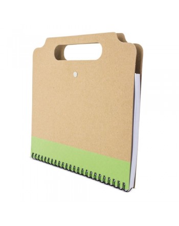 Original libreta de cartón reciclado con forma de maletín.Tiene un detalle de color en ellateral de la anilla. En su interior, además de la libreta con líneas, encontramos un bolígrafo de cartón reciclado a juego con el color del exterior, y un conjunto de notas adjesivas de varios colores.Disponible en 4 colores: azul, negro, pistacho y rojo 70 hojas aprox.