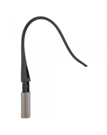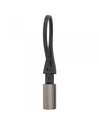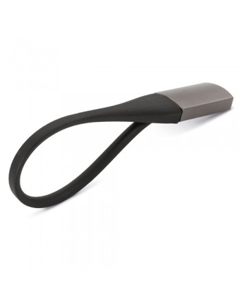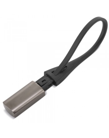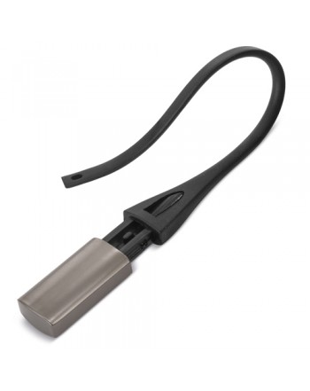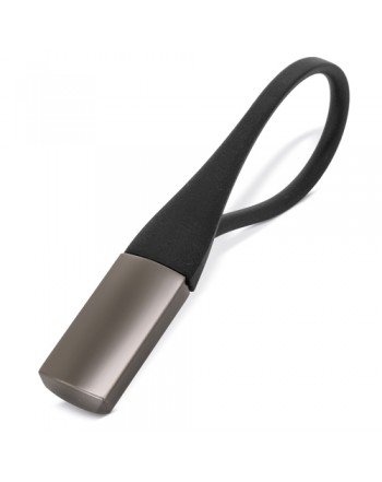 Llavero con cuerpo metálico combinado con una resistente cinta de silicona negra en forma de bucle.
