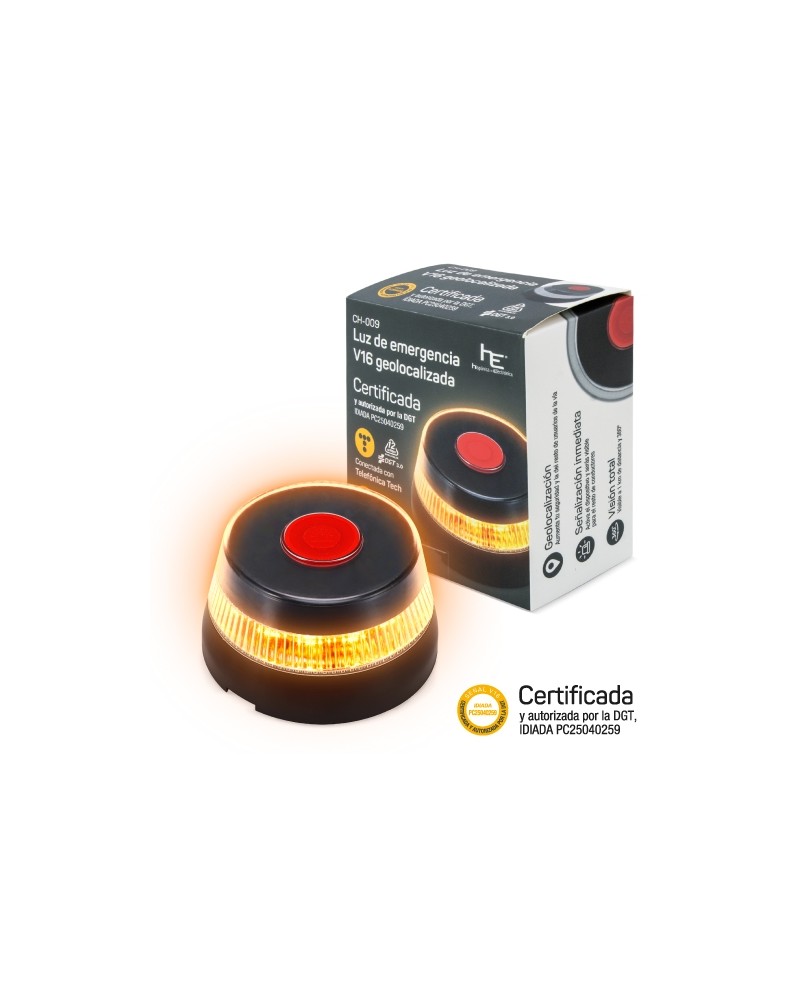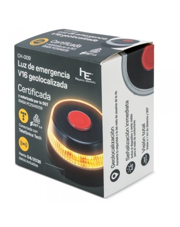 Luz de emergencia V16 geolocalizada. Datos incluidos hasta 01/2038. Conectada con Telefónica Tech. Conexión LoT. Base magnética. Impermeable IP54. Visión total 360º hasta 1km. Incluye pilas (3xLR6 AA).